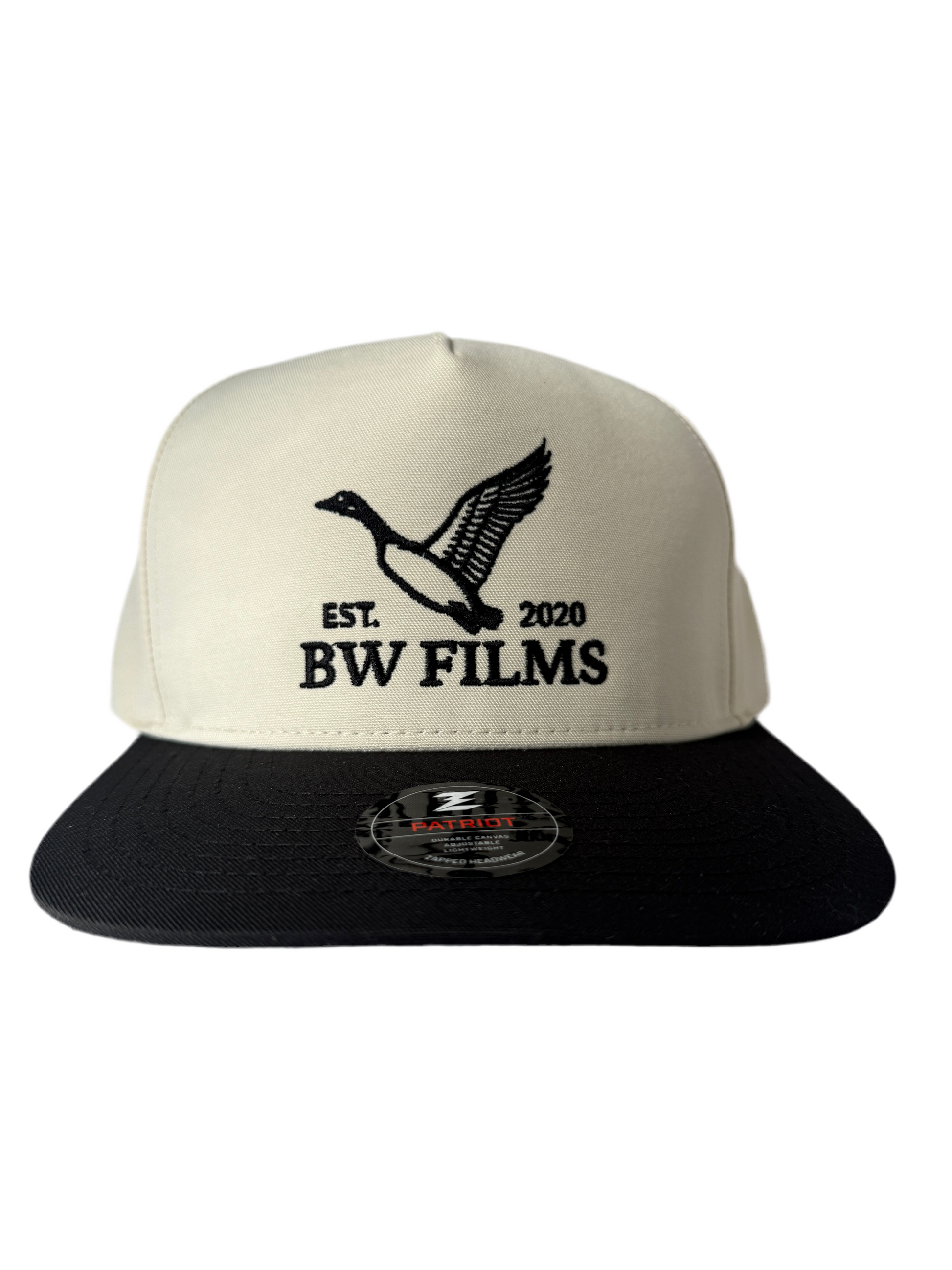 A sharp snapback with a crème crown, black bill, and embroidered goose/BW Films EST. 2020 design. Clean, bold, and built for everyday wear.