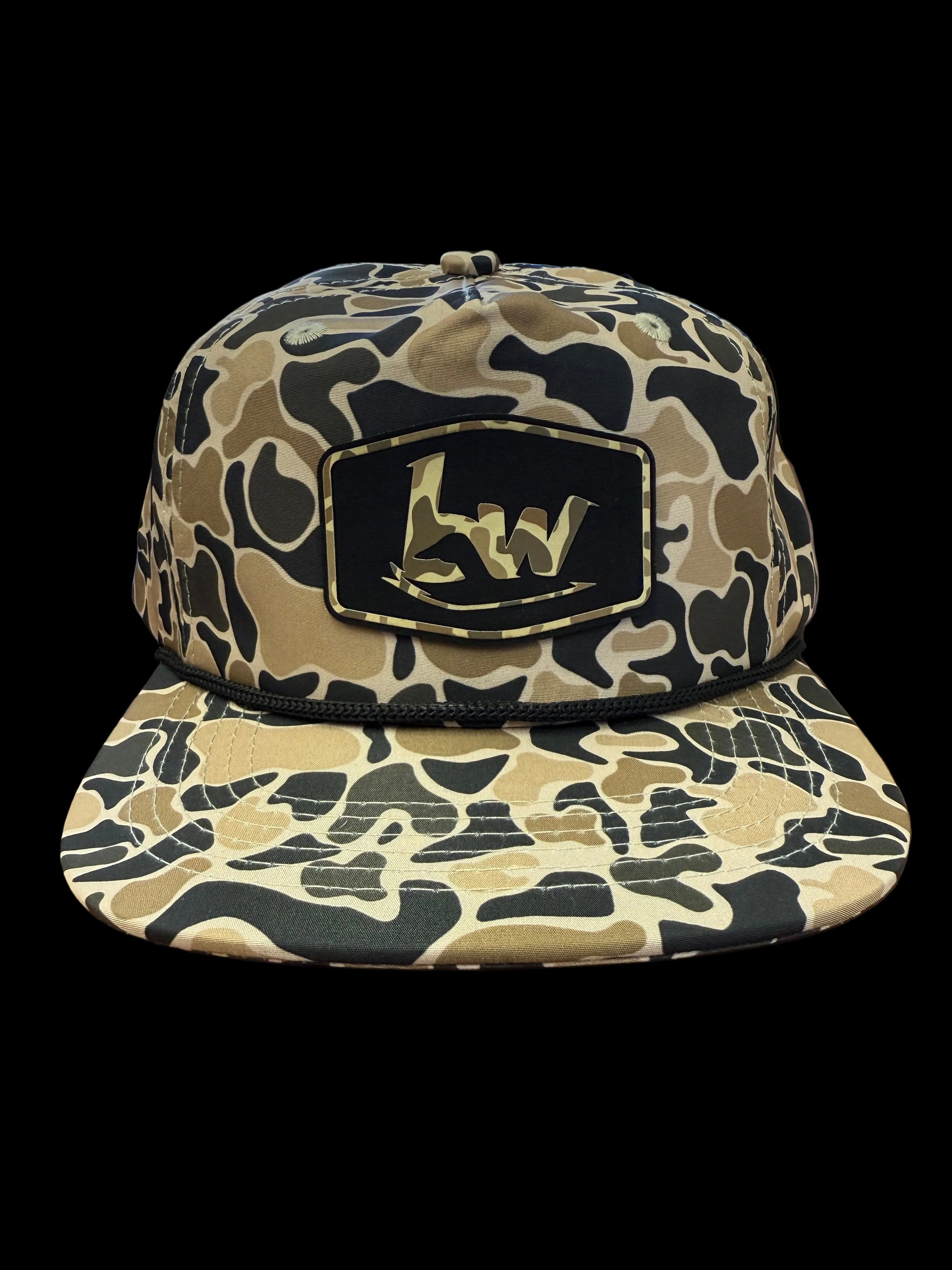 A coyote camo crown with a black rope accent, featuring the Old School camo BW patch. A throwback waterfowl look built for the field and everyday wear.